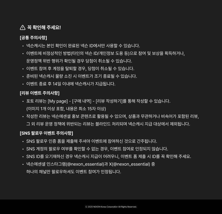 ※ 넥슨에센셜은 사용하는 상품만 생산함으로써 낭비없는 생산으로 자원의 낭비를 막고 환경을 생각합니다. 신중한 구매 부탁드립니다.